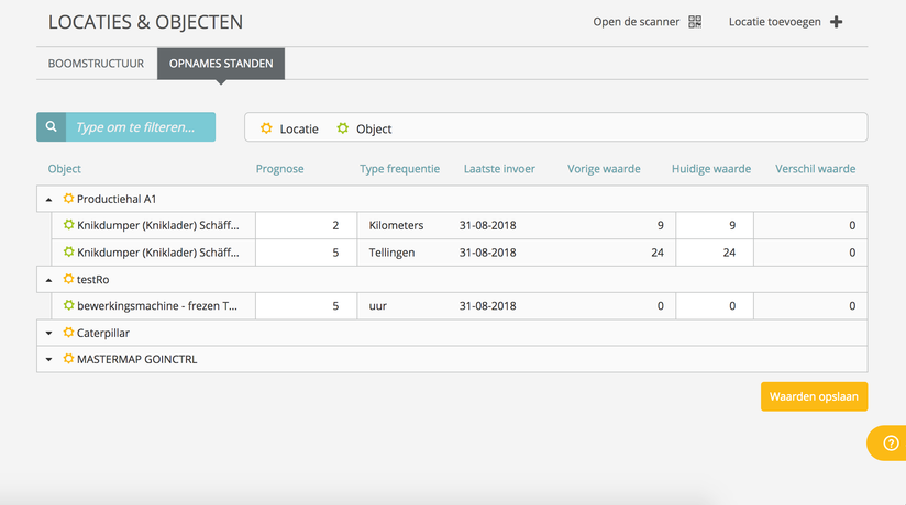 In het onderdeel Locaties & objecten vindt u een pagina Opnames standen. Op deze pagina vindt u een overzicht van de opname standen van de objecten. Het doel van deze pagina is om prognoses en opnamestanden zorgvuldig in te voeren om uiteindelijk regelmatig onderhoud uit te voeren en budgetten opgesteld kunnen worden.
